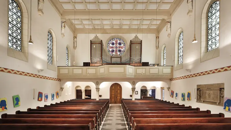 Der Chorraum im Norden ist als Apsis gestaltet. Fünf Buntglasfenster, 1949 nach Entwürfen von Lina von Schauroth gefertigt, zeigen die vier Evangelisten mit ihren Symbolen, die auf den auferstandenen Christus in der Mitte blicken.